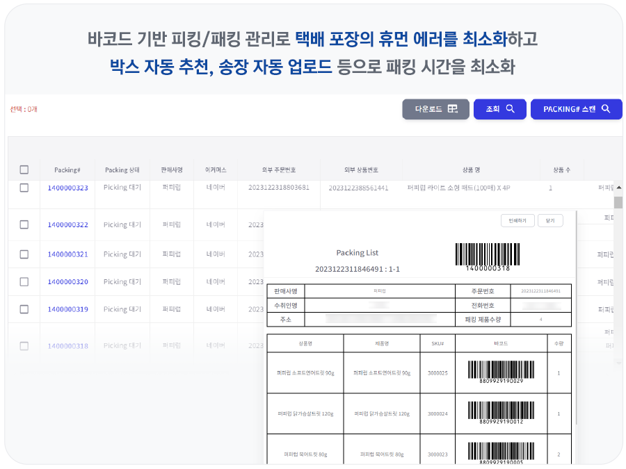 제품의 피킹-패킹-출고 과정을 효율화하여 시간과 비용을 줄이고 정확하고 빠른 배송이 가능하게 합니다.