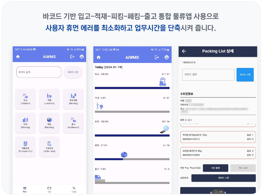 물류 전용 모바일 앱을 사용하여입고-적치-재고-피킹-패킹-출고를